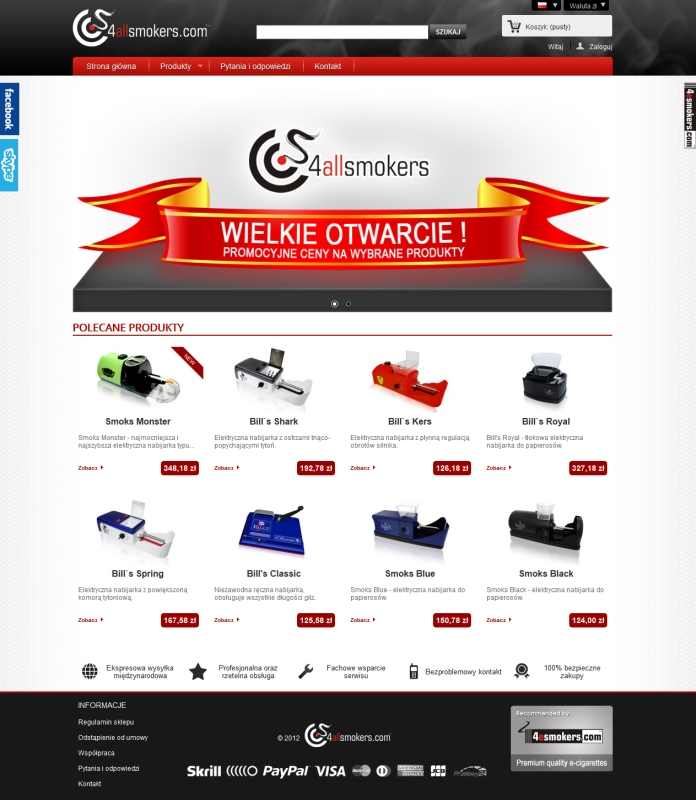 Kompleksowe wykonanie międzynarodowego sklepu internetowego 4allsmokers.com. Instalacja oraz konfiguracja sklepu, wykonanie szablonu graficznego oraz pozycjonowanie. Fotografia produktowa wszystkich towarów wraz z retuszem zdjęć.